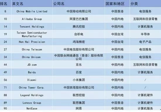 榜單顯示,有14家中國(guó)企業(yè)上榜,其中中國(guó)移動(dòng)有限公司排名最高,排名第8位,阿里巴巴集團(tuán)和騰訊控股分列第10位和第14位。