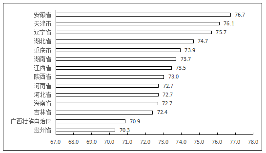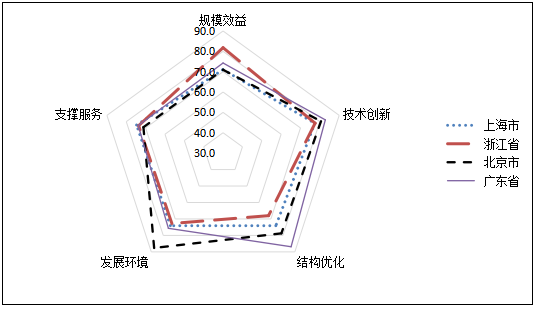 本年領(lǐng)先省份綜合發(fā)展指數(shù)均值為73.8,比上年上升2.5個(gè)分值,技術(shù)創(chuàng)新指數(shù)增長突出,廣東省綜合得分最高;中間省份綜合發(fā)展指數(shù)均值73.5,比上年上升3.4個(gè)分值,規(guī)模發(fā)展指數(shù)增長較快,安徽省綜合得分最高;潛力省份綜合發(fā)展指數(shù)均值65.0,發(fā)展環(huán)境指數(shù)增幅相對(duì)較快,山西省綜合得分最高;重點(diǎn)城市綜合發(fā)展指數(shù)均值69.0,比上年提高0.8個(gè)分值,支撐服務(wù)指數(shù)增幅突出,深圳市綜合得分最高。