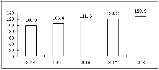 全國綜合發(fā)展指數(shù)采用定基法,選取2014年為基期,設(shè)定2014年綜合發(fā)展指數(shù)為100,通過縱向比較,反映全國軟件業(yè)年度綜合變化情況與發(fā)展趨勢(shì)(見圖2)。