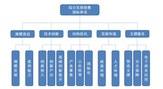 2019年綜合發(fā)展指數(shù)指標(biāo)體系設(shè)置5個(gè)一級(jí)指標(biāo)、13個(gè)二級(jí)指標(biāo)(見圖1),數(shù)據(jù)基礎(chǔ)以我部統(tǒng)計(jì)的2018年軟件和信息技術(shù)服務(wù)業(yè)統(tǒng)計(jì)年報(bào)數(shù)據(jù)為主。