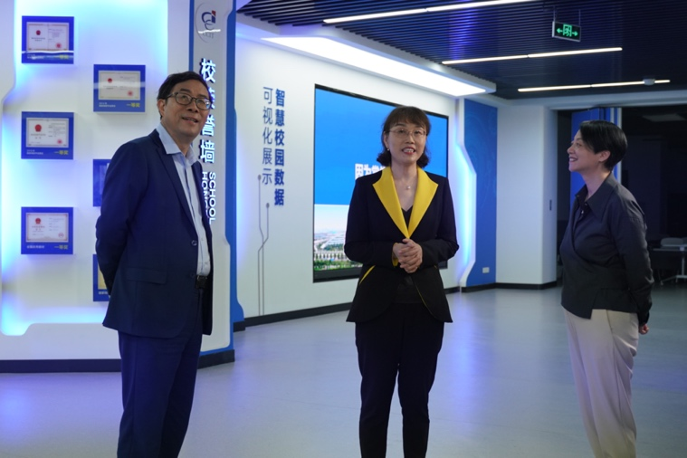 彭凱平教授、梁雅莉總經理與朱敏副校長就學校工業互聯網課程架構及技術賦能進行深入交流